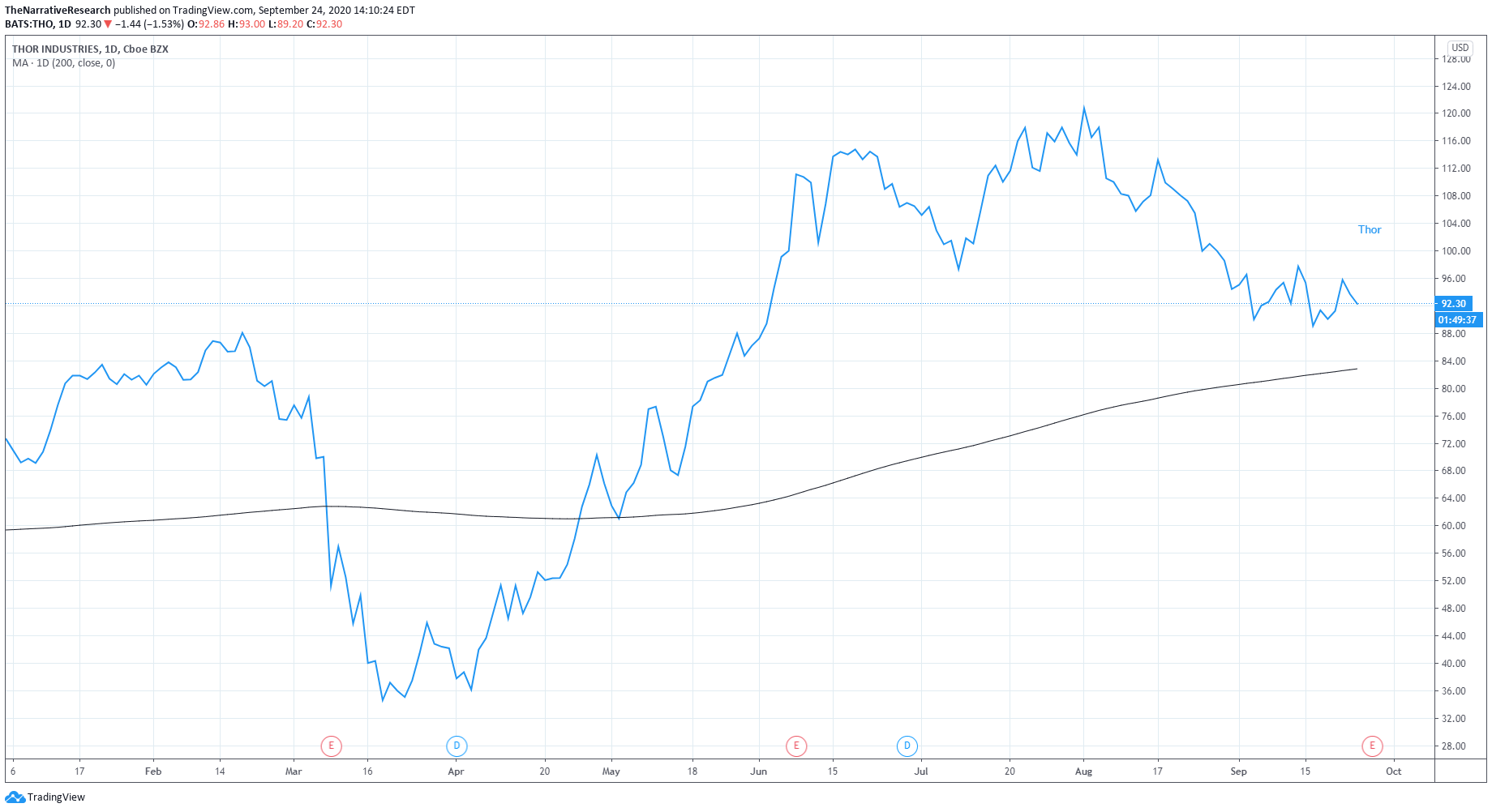 Companies that run up into earnings price themselves for perfection. While a massive beat can still drive the stock higher; a modest beat or a modest miss can pummel the stock price. Typically then I try to avoid stocks that have had big run ups into earnings. I also try to look at the previous years comps to see whether the setup is favorable. Finally I look for comparable companies to see what the industry trends are. It’s rare that you get a setup that checks all the boxes, but Thor Industries ($THO) into earnings on Monday does this.