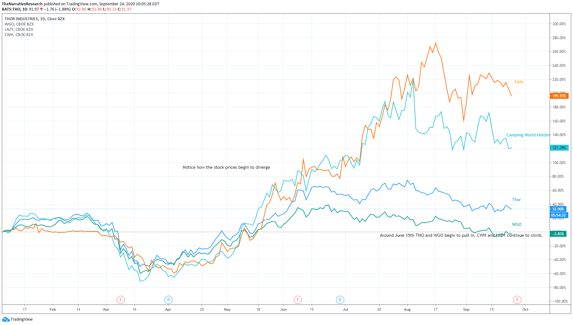 In the chart above you see the stocks of 4 related companies. THO, WGO (Winnebago) are RV manufacturers. LAZY and CWH (Lazyday & Camping World Holdings) are retailers who sell RVs. Notice that over the past 2 months a divergence has emerged with the manufacturers pushing lower and the retailers going higher. In this case we have the benefit of looking at the quarters for the retailers to give us some idea of the demand.